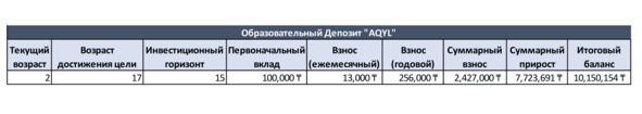 Решением мисс Люси было использовать депозит AQYL по минимуму. Цель – собрать на депозите 10 млн тенге с инвестиционным горизонтов в 15 лет. В качестве первоначального вклада на депозит было положено 100 тысяч тенге. Для того чтобы достичь цели, ее ежемесячные взносы должны составлять всего 13 тысяч тенге в течение всех 15 лет. В таком случае из 10 миллионов на депозите общий вклад мисс Люси составит всего 2,4 миллиона тенге, в то время как 7,7 миллиона будут составлять проценты банка и государственные премии (таблица 5).
