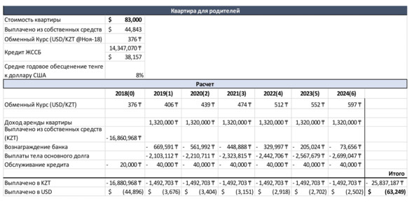 Согласно расчетам ниже (таблица 6) к концу 2024 года квартира родителей обойдется мисс Люси в 63 тысячи в долларовом эквиваленте, что на 20 тыс. меньше заявленной стоимости в 83 тысячи долларов в 2018 году. Разница состоит в основном из дохода от сдачи квартиры в аренду, накопленного к 2024 году, и частично из экономии средств за счет отсрочки платежей по кредиту с учетом среднего обесценения тенге к доллару США (9%).