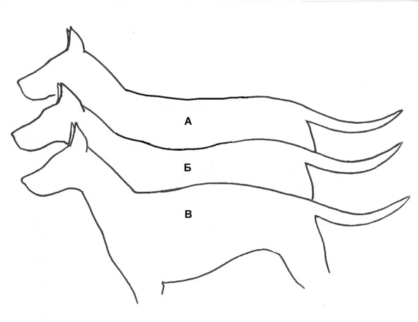 Провислая спина (Рис. 26Б) – линия верха до поясницы в профиль выглядит прогнутой. Она отличается от «переслежины» длиной прогнутой части. Чаще всего провислость образуется из-за неразвитости (в связи с отсутствием физических нагрузок в период развития) и плохой физической формой животного, а иногда – при повышенной гибкости позвоночника. Естественно, что чем длиннее у собак спинной отдел позвоночника, тем чаще встречается тенденция к провислости спины.