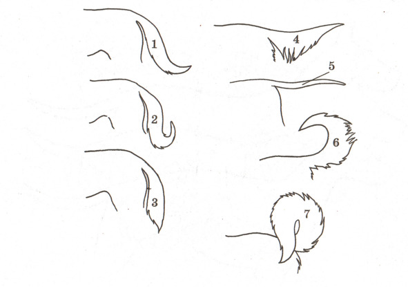Формы хвостов подразделяют на поднятые, опущенные и прутообразные (Рис. 27).