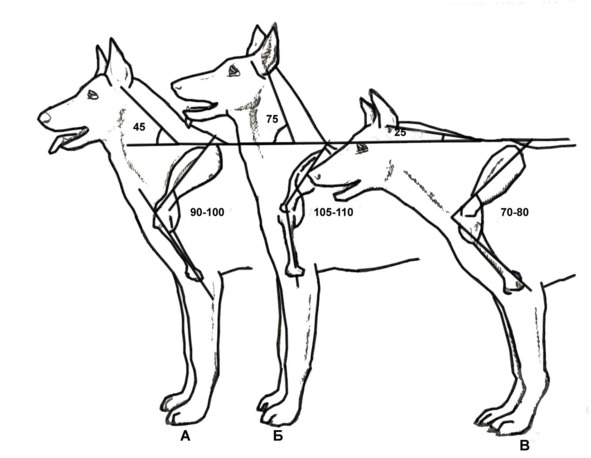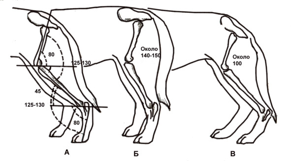 У разных пород собак углы наклона костей задних конечностей в стойке различны (Рис. 33).