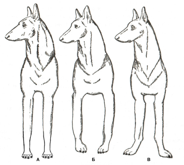 «Косолапость» – вариант постава конечностей, когда лапы собаки повернуты внутрь (Рис. 32 Б). Бывает в силу следующих причин:
