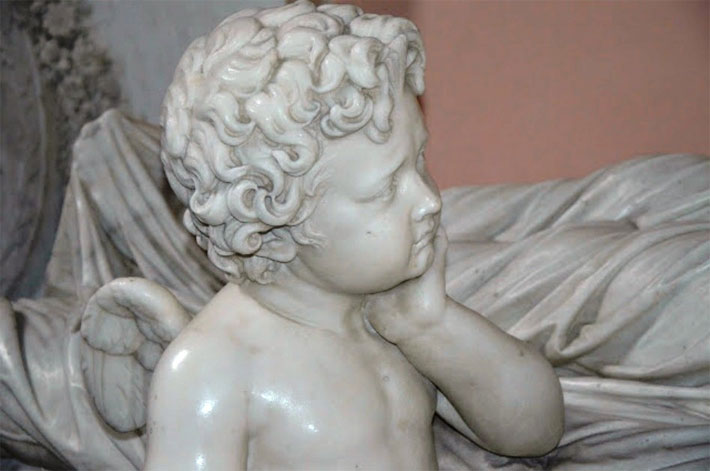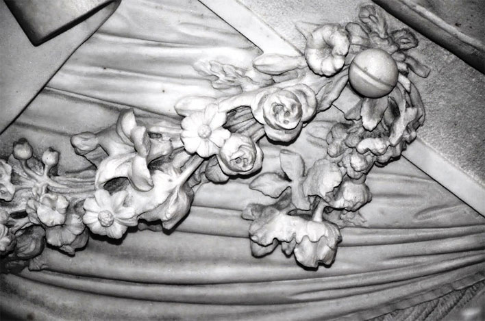Это надгробие исполнено из белого мрамора и является символом чистоты и непорочности души и скоротечности человеческой жизни.