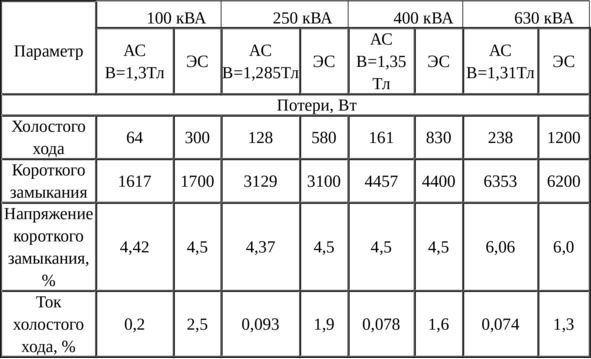Сравнительные проектные параметры силовых распределительных трансформаторов с сердечником из аморфной (АС) и из холоднокатаной электротехнической стали (ЭС) представлены ниже в таблице 1.1.1.