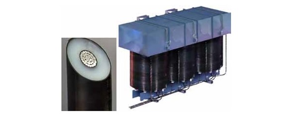 Второе направление уменьшения мощности потерь короткого замыкания – это новый тип трансформатора DryFormer (фирма АВВ Tranformatoren, рисунок 2), обмотки которого выполняются из специального кабеля. Этот кабель имеет многопроволочную медную или алюминиевую токопроводящую жилу, поверх которой наложен тонкий слой полупроводящего материала, что позволяет устранить неравномерность электрического поля, вызванного многопроволочностью жилы. Изоляция такой жилы изготавливается из полиэтилена, ее толщина выбирается из соображений электрической прочности (практически достижим уровень напряжения 220 кВ). Поверх изоляции наложен экран, выполненный также из полупроводящего материала, который заземляется, что обеспечивает рациональное распределение электрического поля. Отсутствие масла, снижение более чем вдвое доли горючих материалов по сравнению с обычным трансформатором устраняют риск пожара, взрыва, загрязнения воды и почвы при повреждении трансформатора. Это позволяет применять такие аппараты в зонах с большой плотностью населения, в подземных установках, в экологически охраняемых регионах. Для такого трансформатора не нужны вводы высокого напряжения; просто кабель, которым выполнена обмотка, протягивается к распределительному устройству на любую длину.