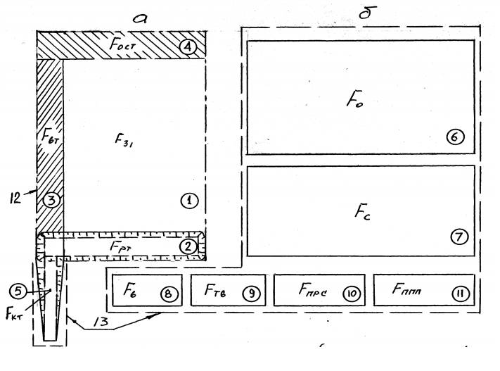 (Структура площадей горного и земельного отводов: а – горный отвод: 1- карьерное поле; 2- разрезная траншея; 3 – выездная траншея; 4 – остаточное выработанное пространство; 5 – капитальная траншея; 12 – граница горного отвода; б – земельный отвод: 6 – отвал пустых пород; 7 – спецотвал; 8 – отстойник карьерного водоотлива; 9 – отвал промышленного мусора; 10 – склад почвенно-растительного слоя; 11 – склад потенциально плодородных пород; 13 – граница земельного отвода.)