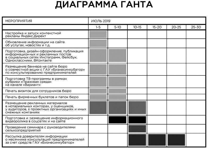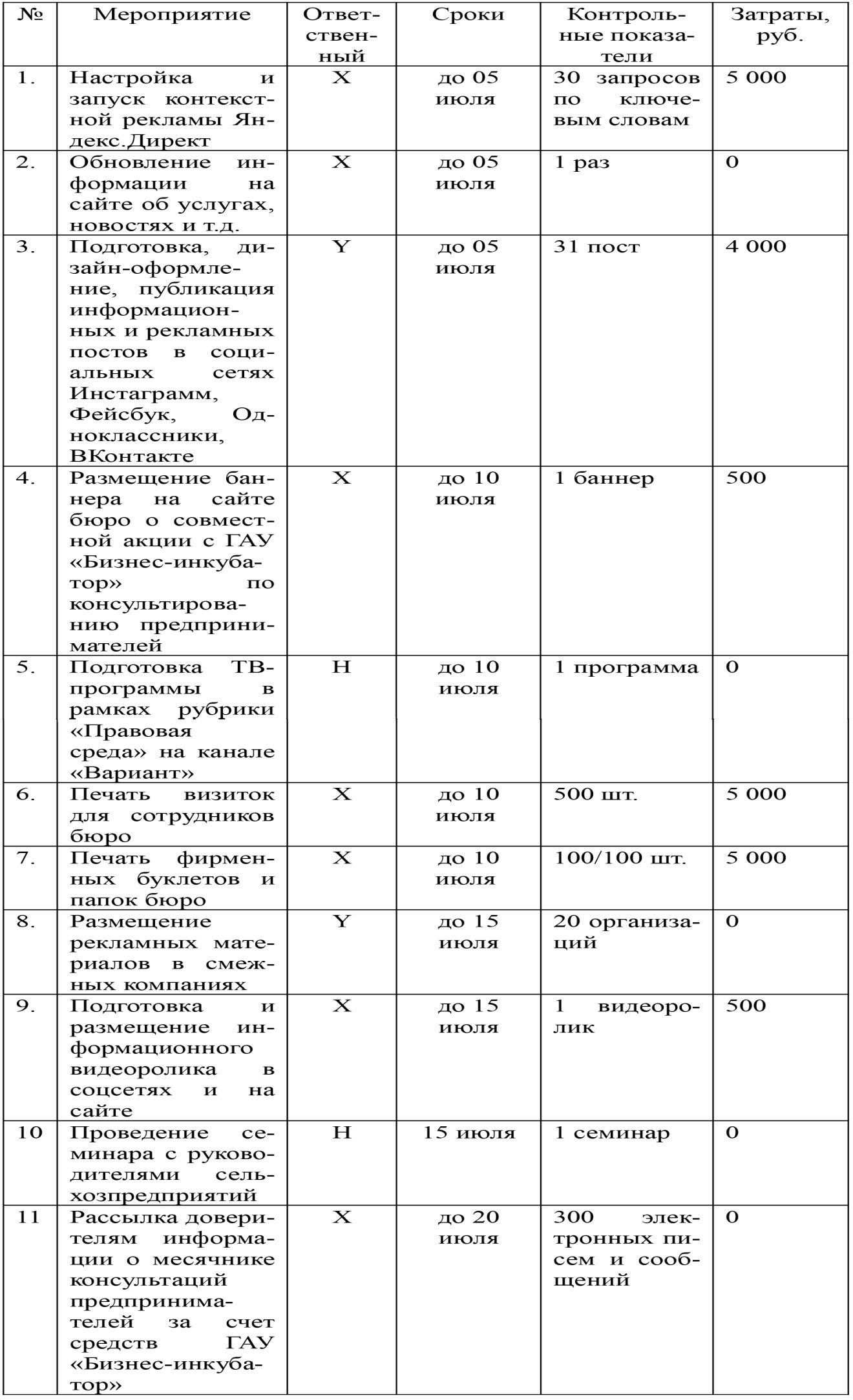 В качестве примера приведем таблицу с рядом маркетинговых мероприятий адвокатского бюро в июле 2019 г.