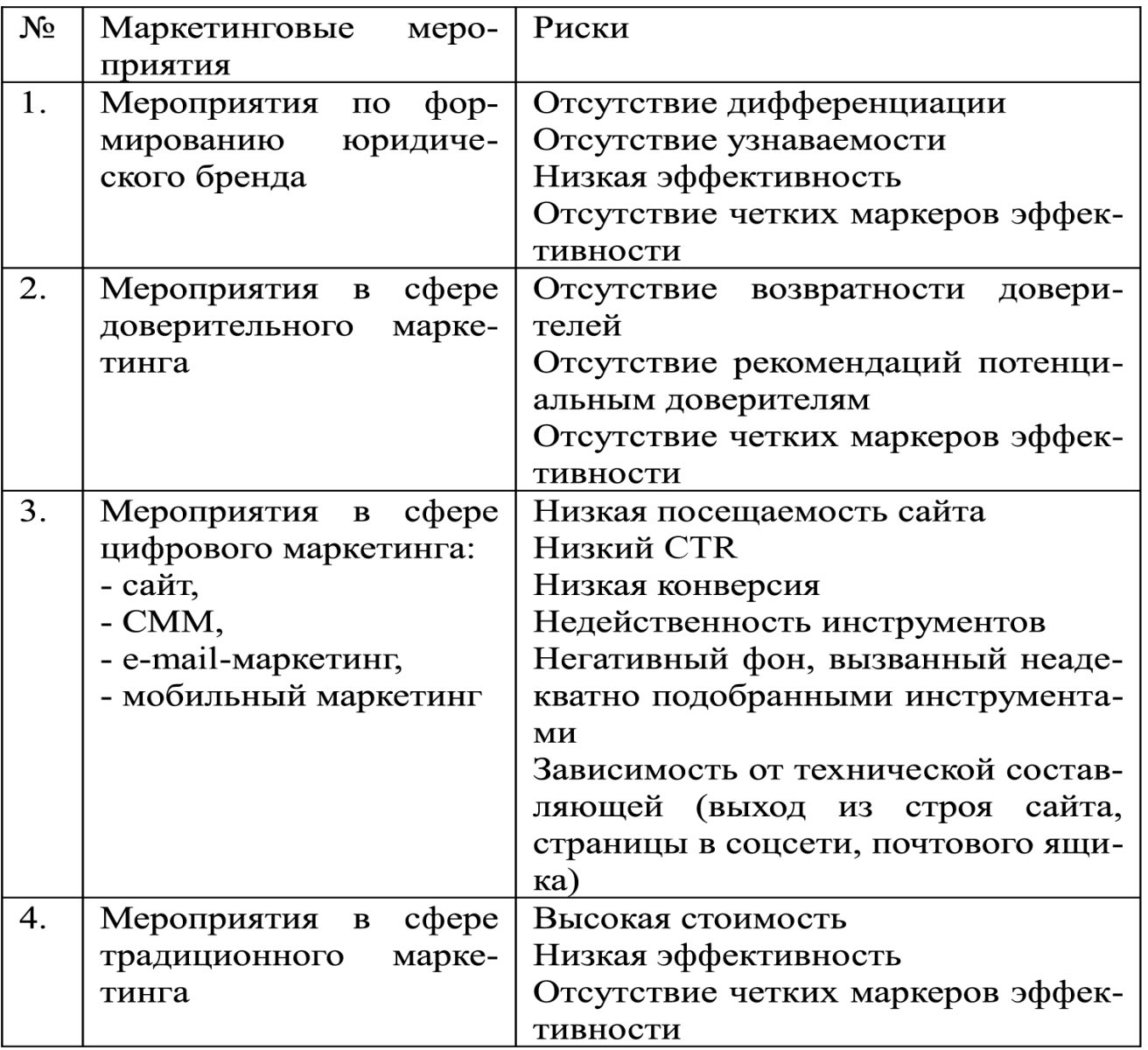 В анализе макро-, микро- и внутренней среды адвокатского бюро автор выделяет основные факторы, связанные с рисками деятельности юридической компании. В настоящем параграфе будут рассмотрены риски предлагаемых автором маркетинговых мероприятий.