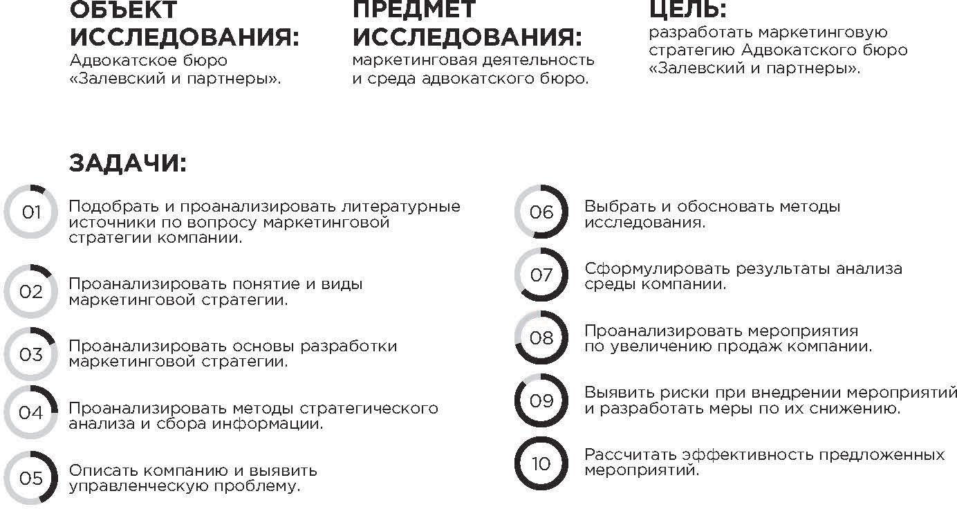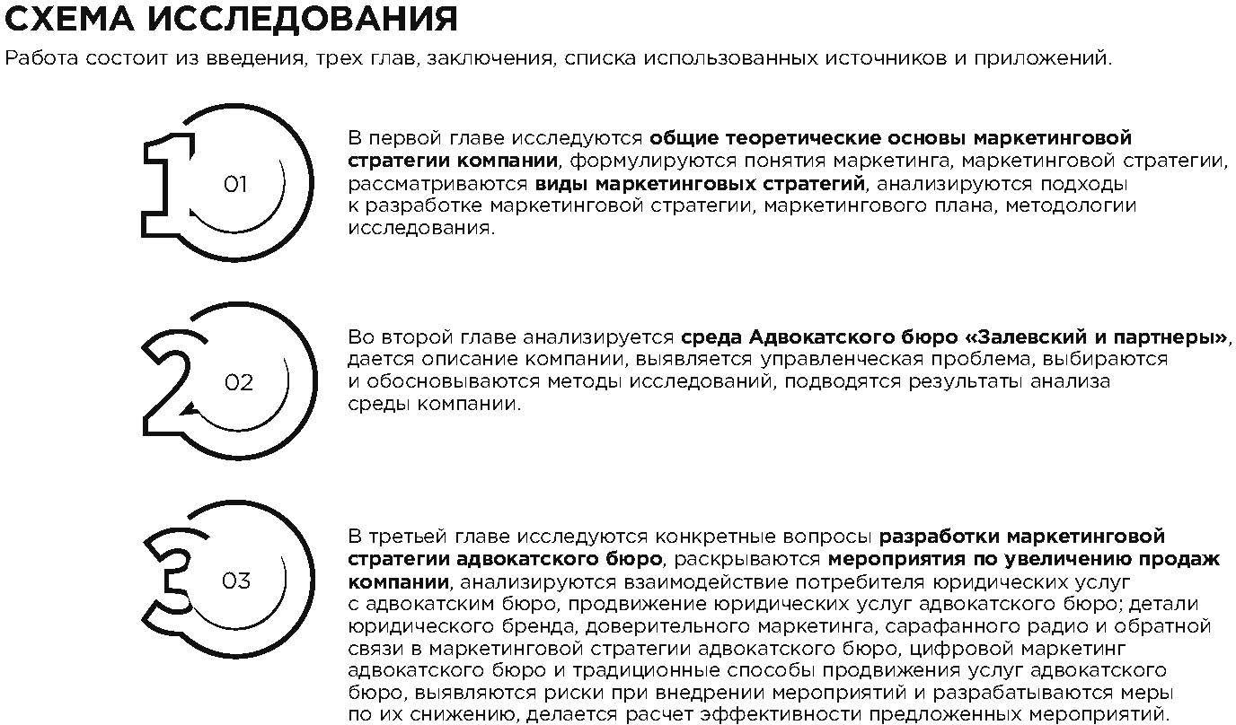 Апробация работы. Маркетинговая стратегия, предложенная в данной работе, обсуждалась на совещаниях партнеров адвокатского бюро «Залевский и партнеры». Было принято решение о внедрении разработанной маркетинговой стратегии в работу бюро.