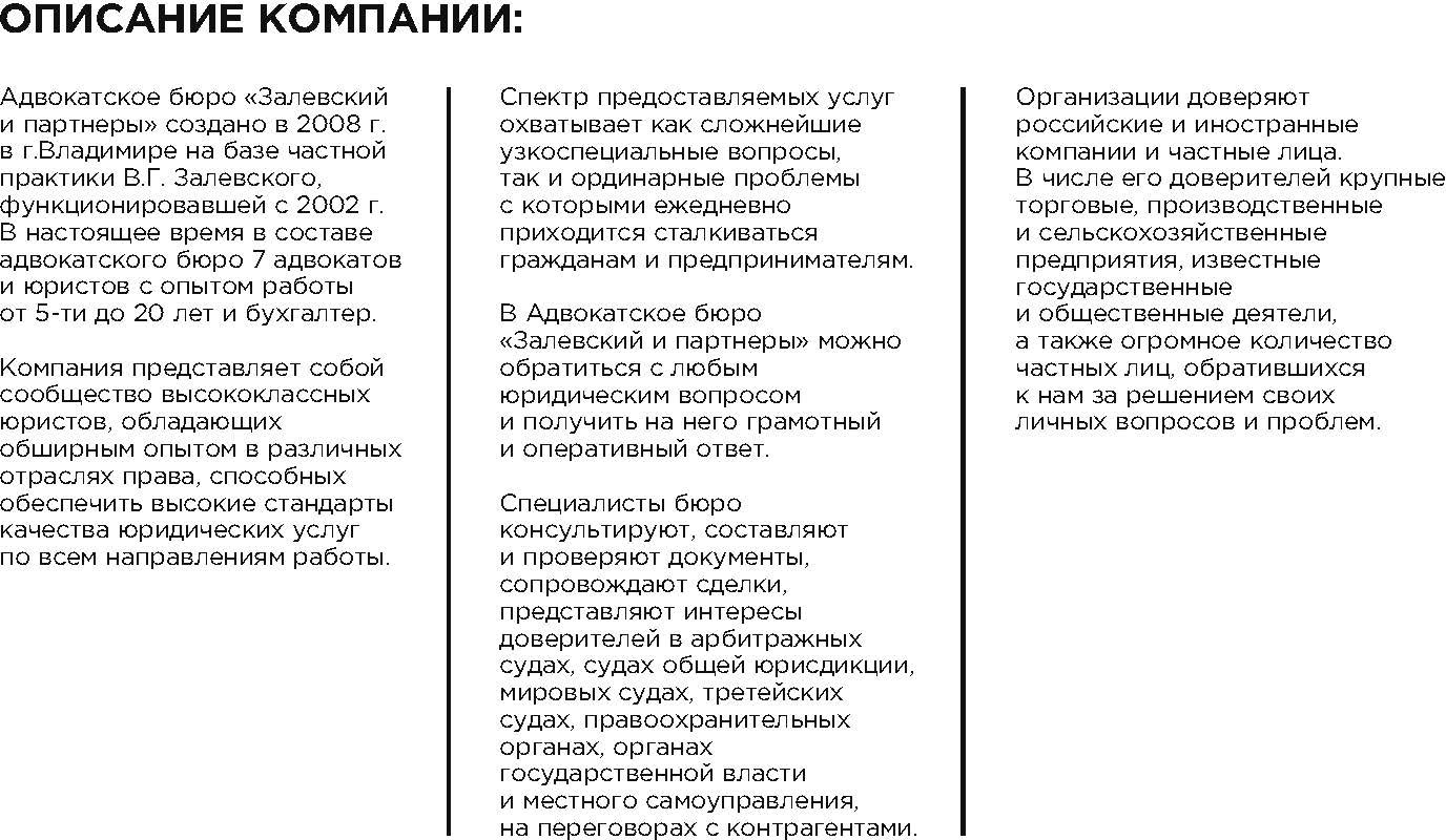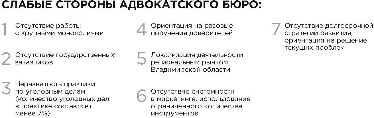 – с точки зрения локации адвокатское бюро ориентировано, прежде всего, на Владимирскую область и ближайшие смежные регионы – г. Москва, Московская, Нижегородская и Ивановская область. При этом основной акцент делается именно на «родном» регионе, где в первую очередь и задействуются инструменты продвижения;