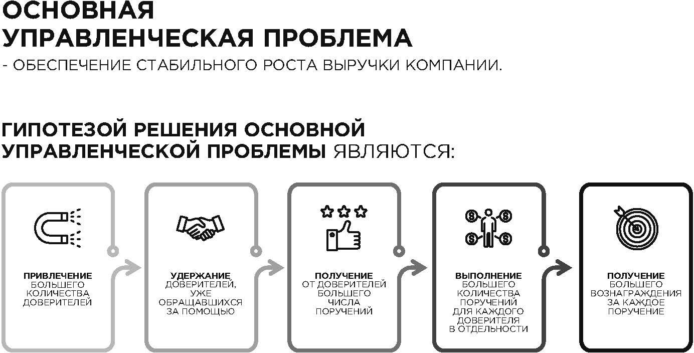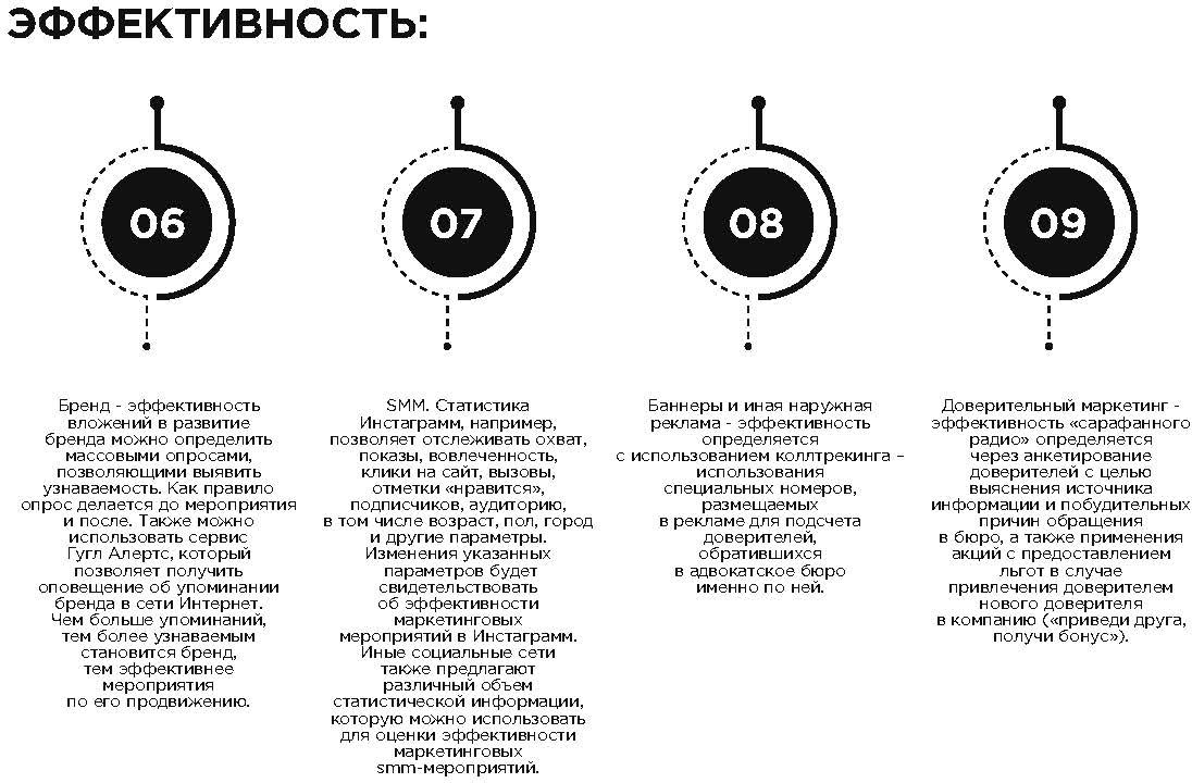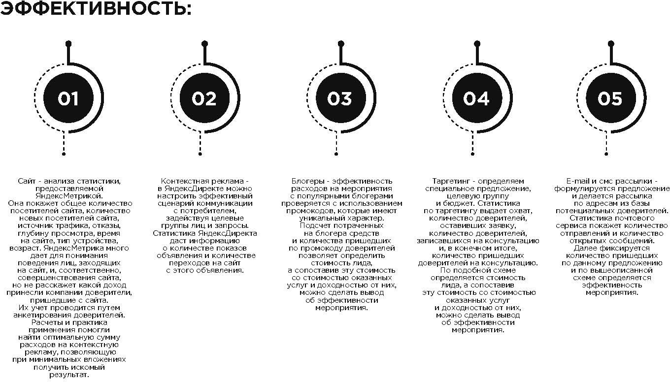 Успешная реализация маркетинговой стратегии немыслима без постоянной аналитической работы: анализа баз данных, опросов доверителей, анализа бизнес-процессов, анализа конкурентов, анализа ценовой политики, анализа линейки услуг, анализа последовательности сделок, анализа контрагентов. Оптимальные методы получения информации: наблюдения, интервью, анкеты, опросы, фокус-группы, исследования, эксперименты, сбор информации, статистическая обработка информации, «тайный» покупатель. Выводы об эффективности маркетингового мероприятия можно сделать на основе изменения объема продаж, рентабельности краткосрочных вложений ROI, изменении валовой прибыли. В главе 3 автором подробно анализируются методы анализа эффективности вложений по отдельным маркетинговым инструментам.