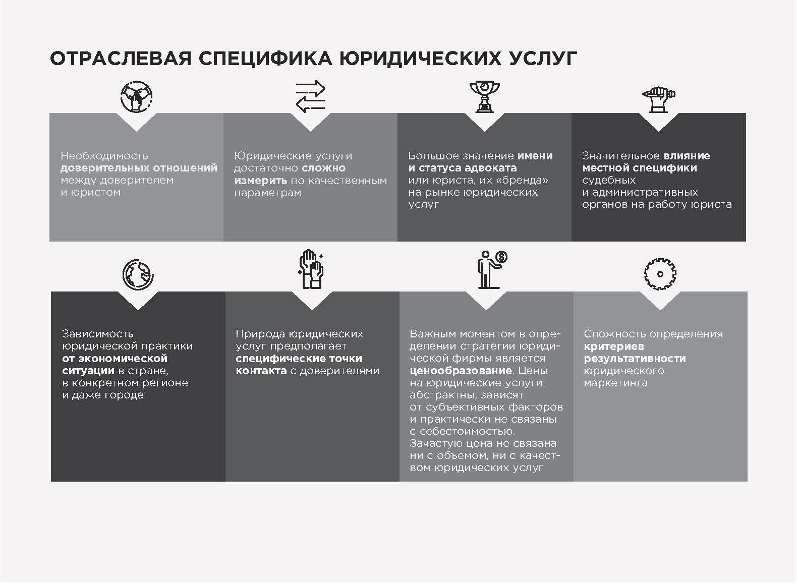 – отправной точкой продвижения услуг адвокатского бюро является формирование юридического бренда компании. Бренд выступает обрамлением услуги, при этом если это обрамление убрать, то услуга в сухом остатке в значительном количестве на рынке юридических услуг тождественна. Разница между услугами юридических фирм на рынке практически отсутствует, обеспечить серьезную дифференциацию конкретной услуги достаточно сложно. Именно поэтому бренд так важен, позволяя выделиться и сформировать ценность услуги;