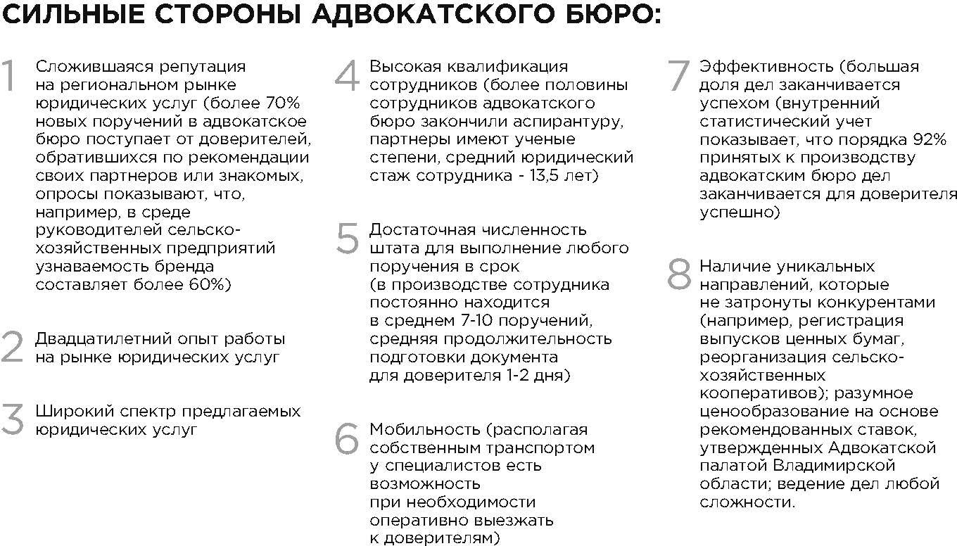 – конкурентные преимущества адвокатского бюро в цене: оптимальное соотношение цены и высокого качества услуги, вариации ставок в зависимости от специалиста;