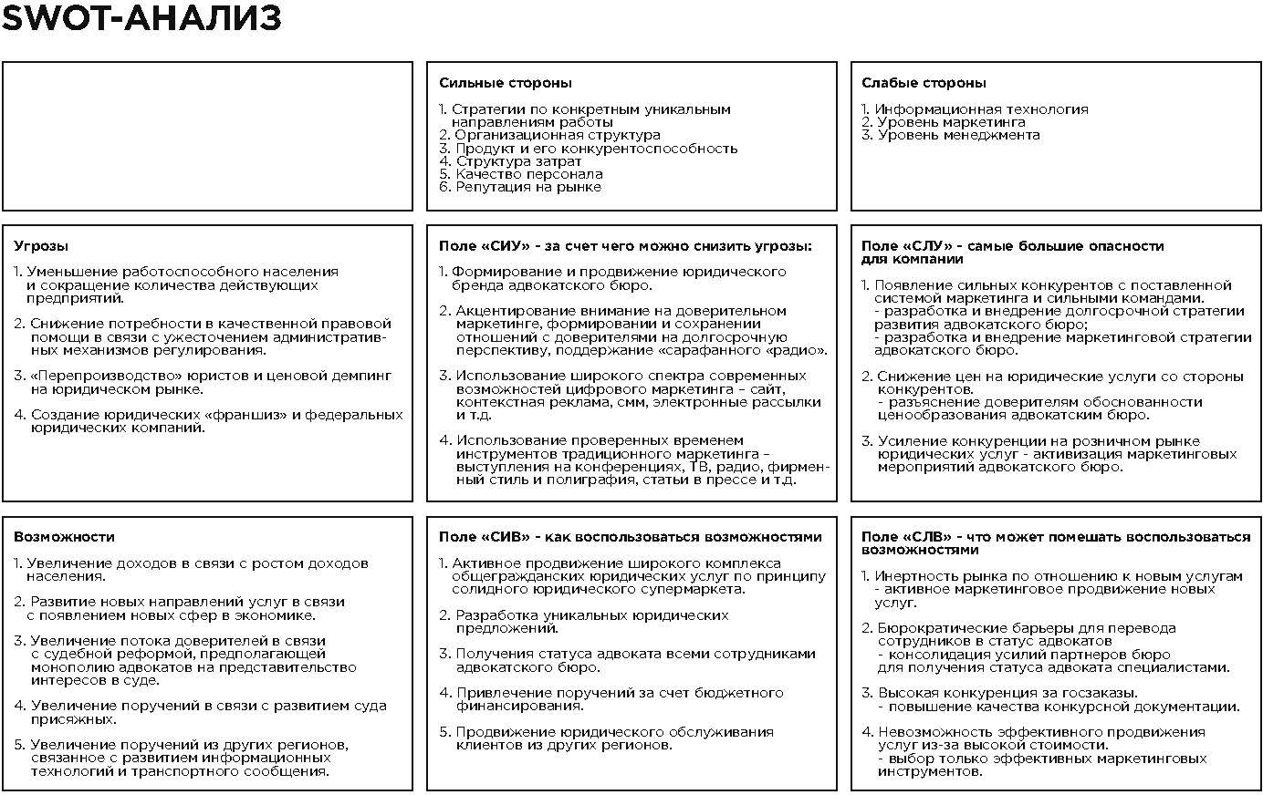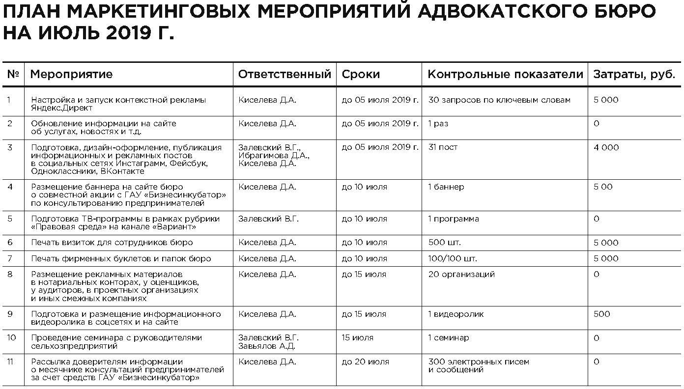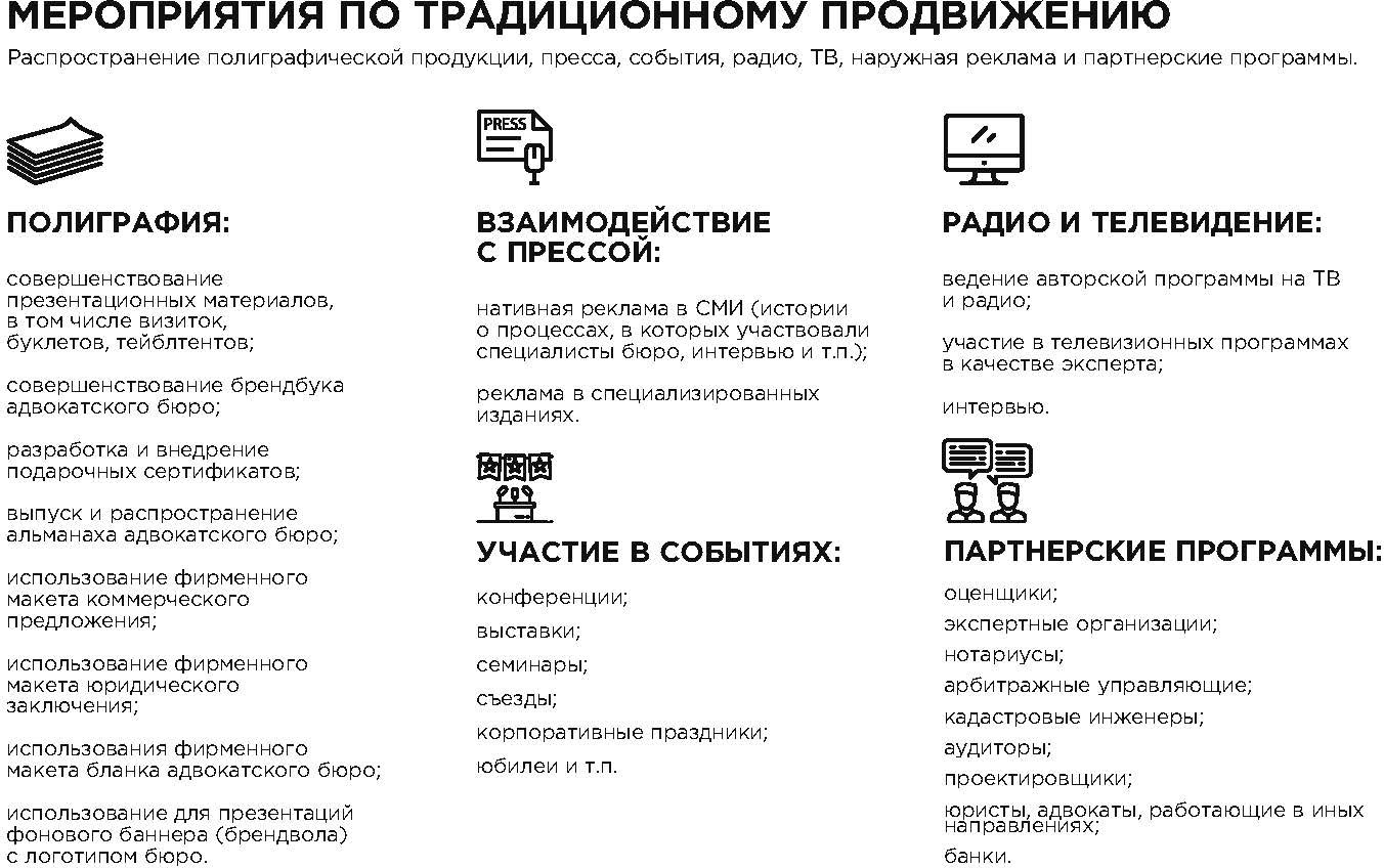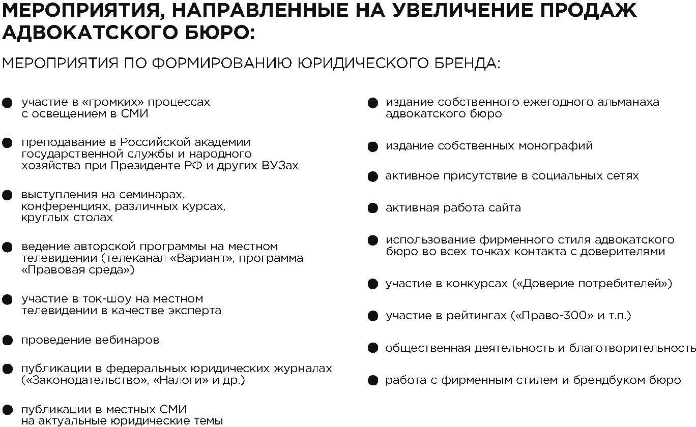 Практика маркетинга предлагает многообразие маркетинговых мероприятий и инструментов, которые адвокатское бюро может использовать в целях увеличения продаж своих услуг. При этом очевидно, что залог успеха кроется в их комплексном и системном использовании.