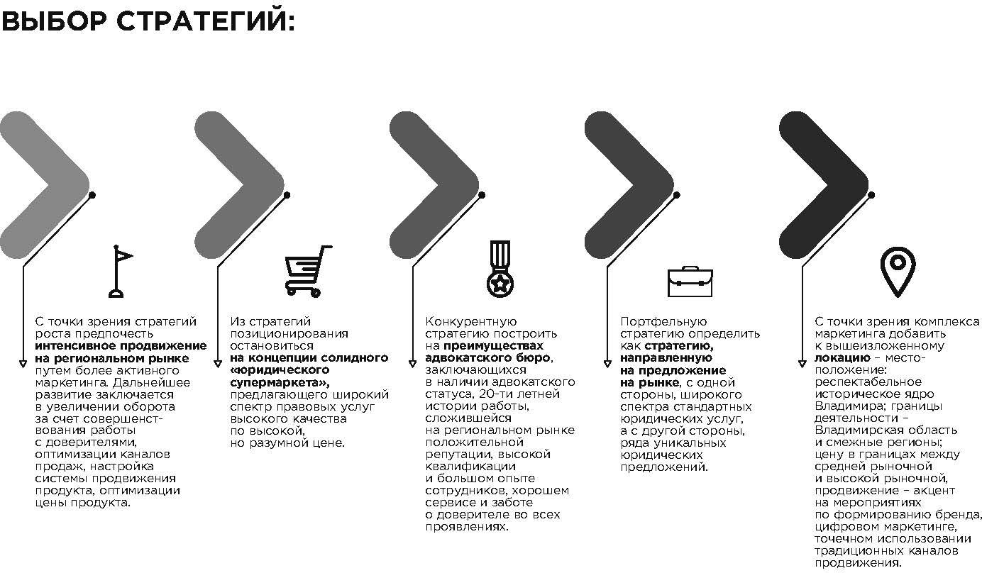С точки зрения маркетинговой стратегии юридических компаний речь чаще всего идет о необходимости формирования юридического бренда, доверительном маркетинге, «сарафанном радио», системе обратной связи с доверителями, цифровом маркетинге, SMM-продвижении и традиционных инструментах, проверенных временем. В настоящей работе автором рассмотрены многочисленные конкретные мероприятия, которые осуществляет и планирует осуществлять адвокатское бюро в целях увеличения продаж своих услуг, а также особенности их реализации.