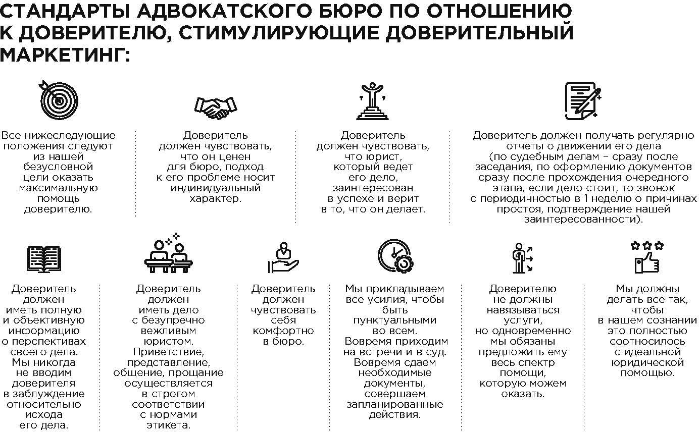 – задача адвокатского бюро расположить к себе доверителя, сделать для него больше, чем он ожидал, сохранить отношения, получать обратную связь, положительные рекомендации и новые поручения, а также максимально задействовать «сарафанное радио», которое представляет собой передачу информации о соответствующих услугах от потребителя к потребителю;