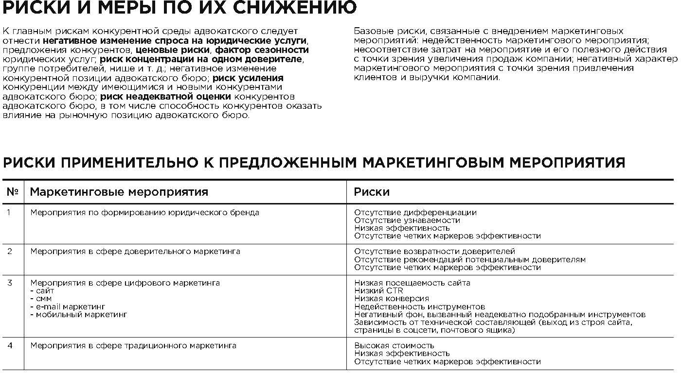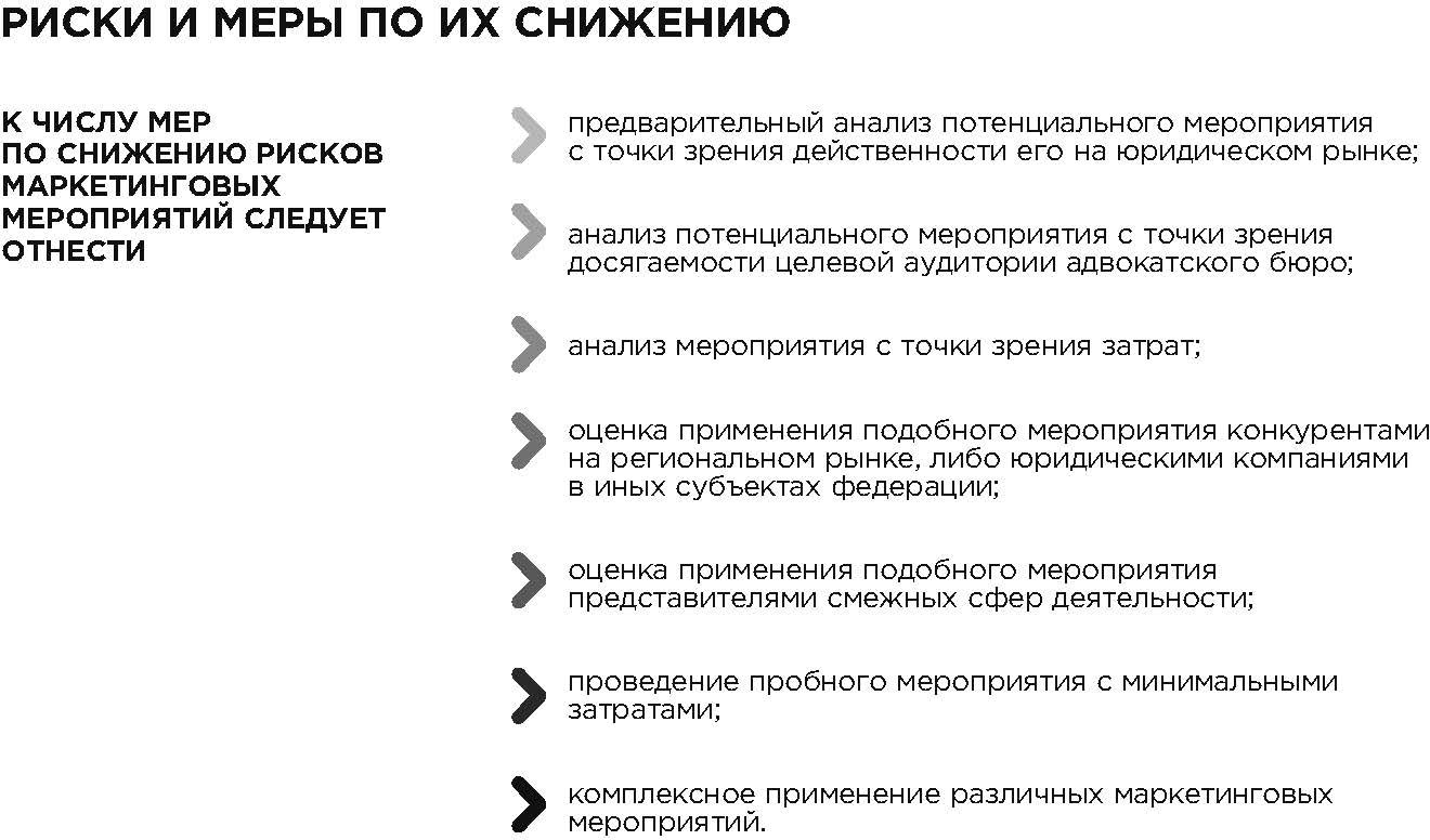 К числу мер по снижению рисков маркетинговых мероприятий автор отнес предварительный анализ потенциального мероприятия с точки зрения действенности его на юридическом рынке; анализ потенциального мероприятия с точки зрения досягаемости целевой аудитории адвокатского бюро; анализ мероприятия с точки зрения затрат; оценку применения подобного мероприятия конкурентами на региональном рынке либо юридическими компаниями в иных субъектах федерации; оценку применения подобного мероприятия представителями смежных сфер деятельности; проведение пробного мероприятия с минимальными затратами; комплексное применение различных маркетинговых мероприятий.