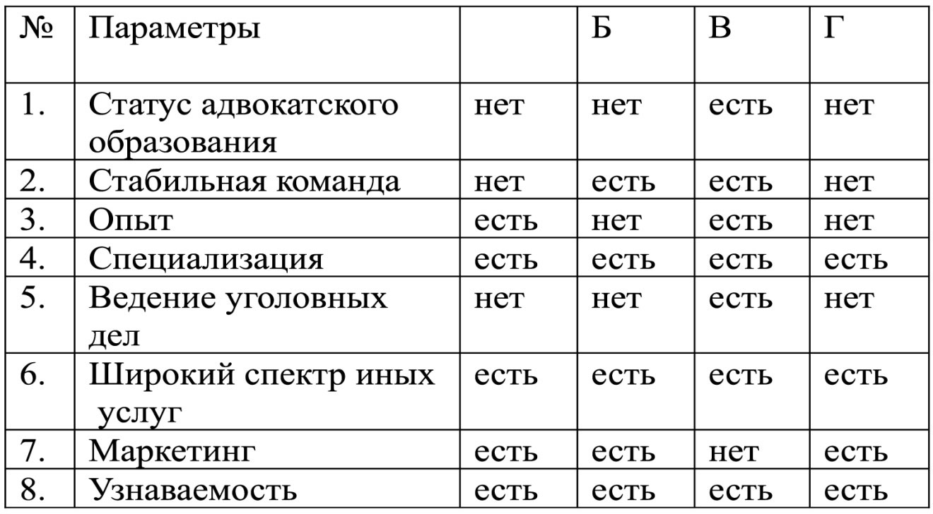 Рассмотрим в качестве примера ряд конкурентов адвокатского бюро «Залевский и партнеры» на юридическом рынке Владимирской области, обозначив их условно А, Б, В, Г.