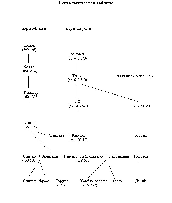 В то время мидийцы еще сами платили дань скифам, поэтому их царь Киаксар видел в персах скорее союзников, чем вассалов. Чтобы упрочить союз, он женил персидского царя Камбиса20 на внучке, благодаря чему их сын Кир смог стать законным царем Мидии и возвысить персов над другими народами.