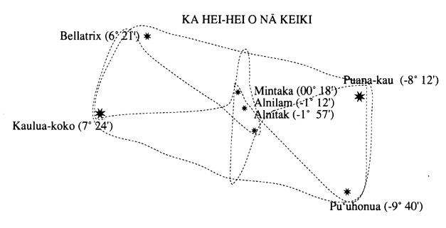 Это созвездие на Гавайях называется «Ка хеи-хеи о на кейки», то есть буквально «Детская игра в верёвочку» [15]. Сама же веревочная фигура называется Паук [17], что перекликается с маршрутом движения созвездия: небесный экватор у гавайцев – это Путь Паука. В классической астрономии это созвездие – центральная часть Ориона: