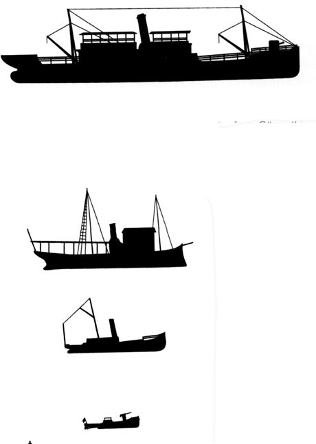 Относительные размеры судов, действовавших на озере Танганьика (сверху вниз): „Graf von Götzen“, „Hedwig von Wissmann“, „Kingani“/„Fifi“, „Mimi“ и “Toutou“