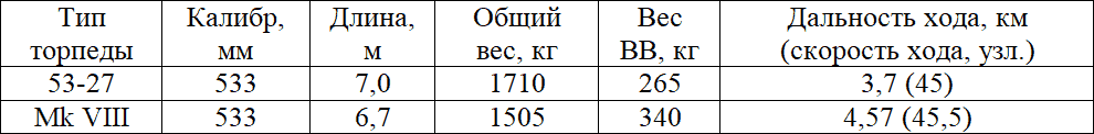 В большинстве источников торпедный боезапас оценивается в 8 штук (4 в аппаратах и 4 на стеллажах), но многие приводят 10 торпед (скорее всего дополнительные торпеды могли размещаться на настиле первого отсека).