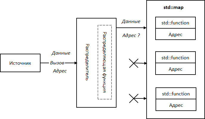 Какой выбрать контейнер? На эту роль лучше других подойдет std::map. Во-первых, не нужно вводить новую структуру для хранения адреса и аргумента, контейнер реализует ее естественным образом в виде пары «ключ-значение». И, во-вторых, std::map осуществляет быстрый поиск по ключу, в качестве которого выступает адрес. Структурная схема изображена на Рис. 25.