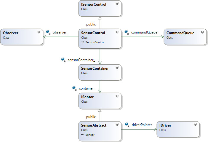 Класс ISensorControl объявляет интерфейс модуля, класс SensorControl реализует указанный интерфейс. SensorControl содержит классы Observer (отслеживает пороговые значения), CommandQueue (очередь комманд для асинхронных запросов), SensorContainer (реализует контейнер для хранения классов для работы с датчиком).