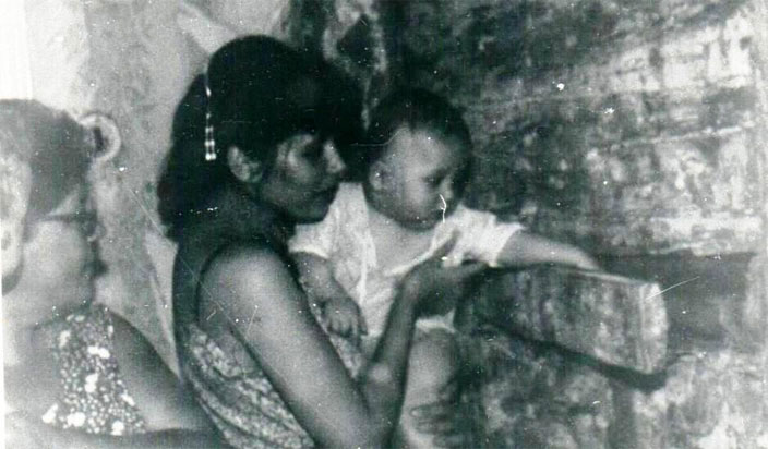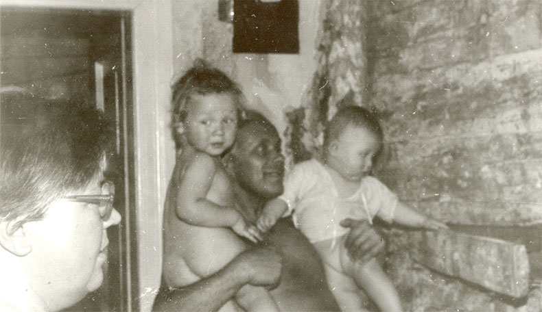 На память об этом случае у нас сохранились фотографии, на которых Виктор с топором "рушит стену", а вокруг него стоят ожидающие любопытные наши малыши.
