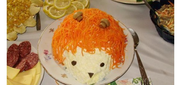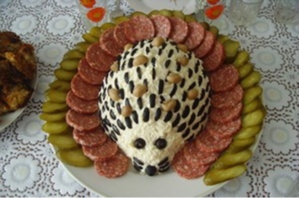 Приготовление: салат выкладываем слоями, промазывая каждый слой майонезом. Слои выкладывать продолговатой горкой, придавая салату форму ёжика. Салат получается очень вкусный.