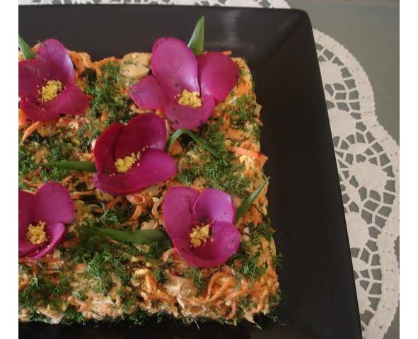 Приготовление: морковь натереть на корейской тёрке, грибы – пластинками, лук кольцами, Добавить чеснок и оба сорта перца. Масло раскалить, залить им это всё и Добавив уксусную эссенцию, перемешать. Куриное мясо порезать кубиками, желтки натереть на тёрке, оставив белок для украшения. Всё смешать и оставить настояться при комнатной температуре. Белок натереть на тёрке. Выложить салат на тарелку в виде прямоугольника, посыпать сверху белком и мелкорубленой зеленью укропа. Редиску нарезать тонкими пластинками и поместить в сок красной свеклы. Когда будущие лепестки немного скрутятся, вынуть и положить на полотенце бумажное, чтобы удалить лишнюю влагу. Сделать из них цветки крокуса и украсить ими салат. Серединка Делается из тёртого желтка.