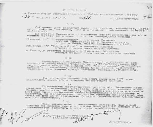 And this is the order No.121 of August 26, 1947 for the Baltic State Fisheries Trust. He celebrates and encourages the editorials of the All-Union Social Competition in the second quarter of 1947.