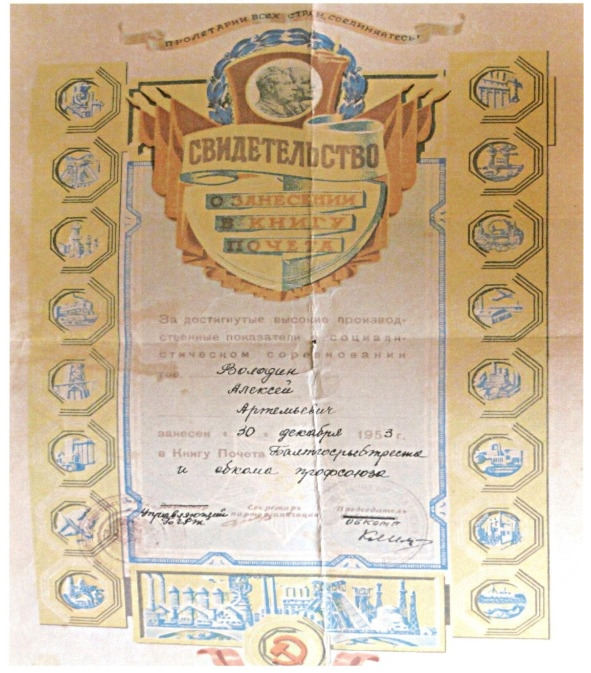 For the high production performance achieved in the socialist competition. Volodin Aleksey Artemyevich was put down to the Book of Honor of the Baltgosrybtrest and the Trade Union Committee on December 30, 1953.