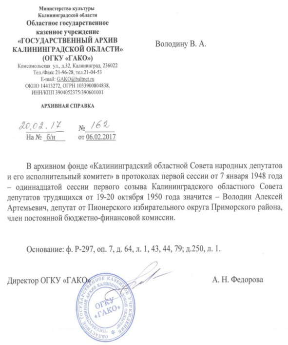 In the archive fund “Kalingrad Regional Council of People’s Deputies and its Executive Committee” in the minutes of the first session of January 7, 1948 – the eleventh session of the first convocation of the Kaliningrad Regional Council of Workers’ Deputies October 19—20, 1950 is Volodin Aleksey Artemyevich, a deputy from the Pioneers constituency of the Primorsky district and a member of the permanent budget and financial commission.