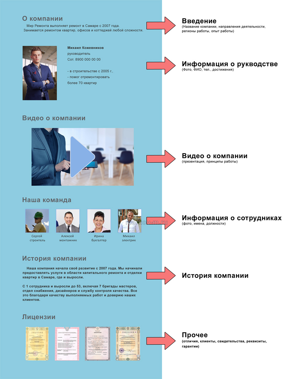 Если на сайте разместить фотографию руководителя с указанием мобильного телефона и Ф.И.О., то это тоже значительно повысит доверие к компании. Телефон, Ф.И.О. и фото директора – это, пожалуй, самая эффективная часть раздела «о компании», т. к. посетитель знает как и к кому обращаться в случае проблем, следовательно больше доверяет. Дополнительно можно указать опыт работы, достижения в данной области, но очень кратко, например: «в строительстве с 2005 г.», «помог отремонтировать более 70 квартир». Также можно кратко написать мысли(девиз), которыми вы руководствуетесь в работе.