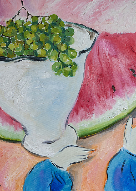 I'm painting. I want to depict this watermelon – in appetizing way. I am adding my author ceramics with grapes – a new character in still- life. There are many colors in my palette: red cadmium, transparent pink, carmine, ultramarine, cobalt, azure, violet, yellow cadmium, gray, carbon black, umber. I am forming the composition with luscious brush strokes – such a pleasure!