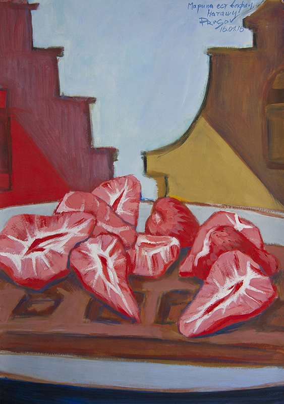 Unfortunately the cafe got closed a few minutes ago and we did not have a chance to enjoy juicy strawberries on a crispy waffle. «We will look at your painting and calm down, – my friends joked, – what else are we supposed to do?».