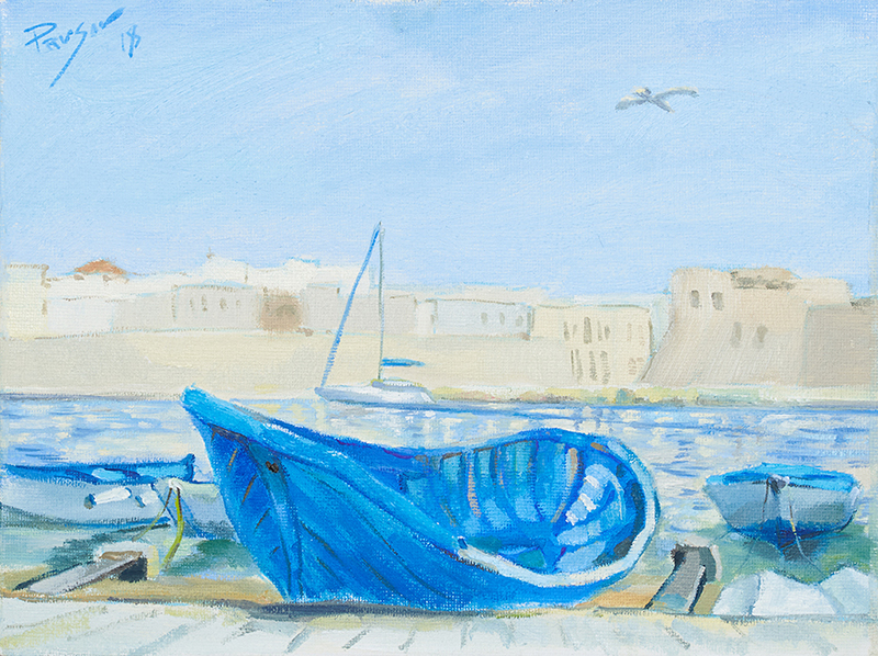 I wish to paint a boat but where to find a special one, with spirit? My path led to Gallipoli – a town in Apulia in the south of Italy. I walked around a small historic center, visited the bay. I was not satisfied, I didn't see a composition. Having passed an ancient fountain in the town bay I found that I was looking for – a charismatic boat. It was abandoned but the artist would paint it – he loves blue color!