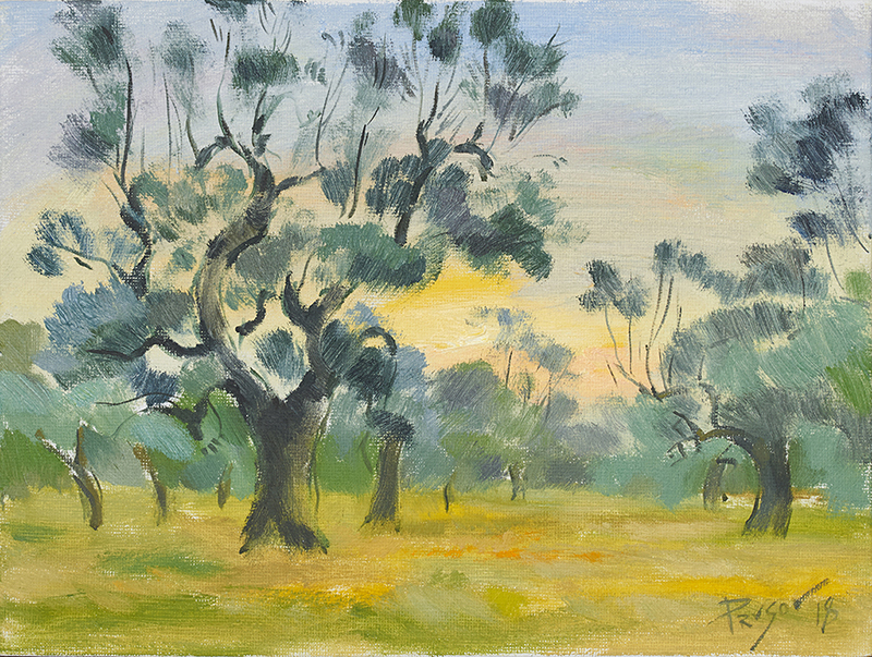 Olives at sunrise. 2018. Canvas on cardboard, oil. 18x24 cm