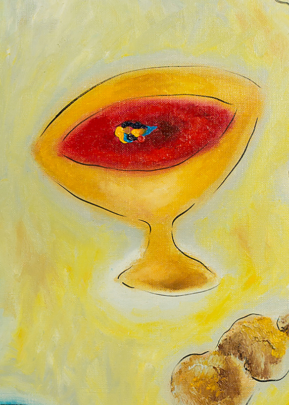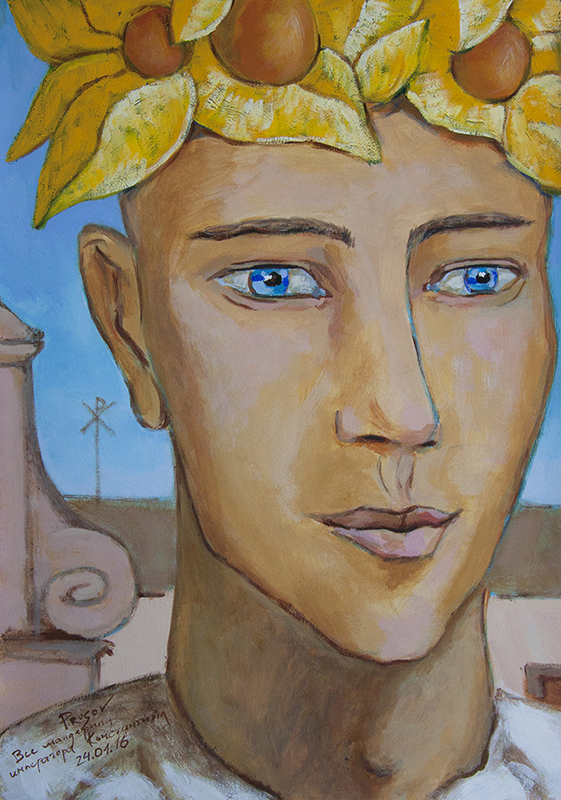 However this work is not about Konstantin's acts but it's about the pursuit of new horizons. The young emperor is wearing an extraordinary wreath – tangerines represent the symbol of his power. Why not – the emperor is free to create new symbols. His eyes are powerful tool given him by God. And if you don't interfere with Konstantin you will never see the reflection of destructive force in his eyes which lays deep in his subconscious.