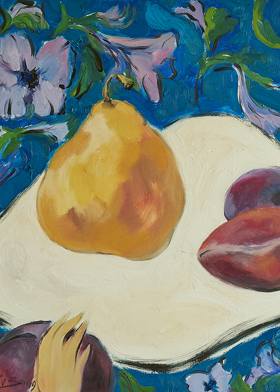 A pear and plums against petunias. 2019. Canvas, oil. 70x80 cm