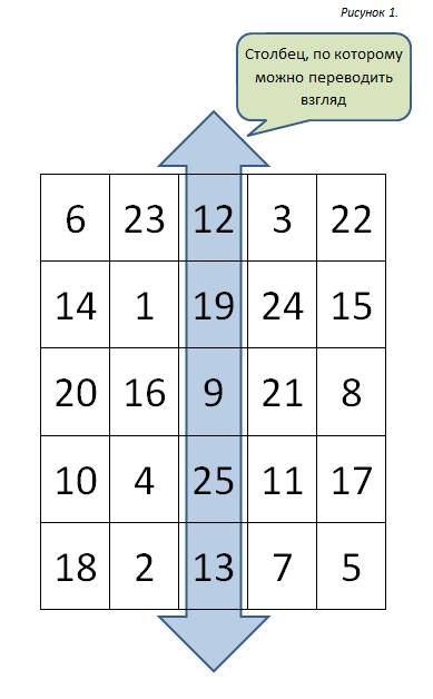 Как выглядит таблица Шульте, вы можете увидеть на рисунке 1. Для развития периферийного зрения (увеличения угла осмысленного восприятия информации) необходимо найти в таблице все 25 цифр по порядку, при этом взгляд фокусировать можно только на клеточках центрального (среднего) столбца (смотри рис.1