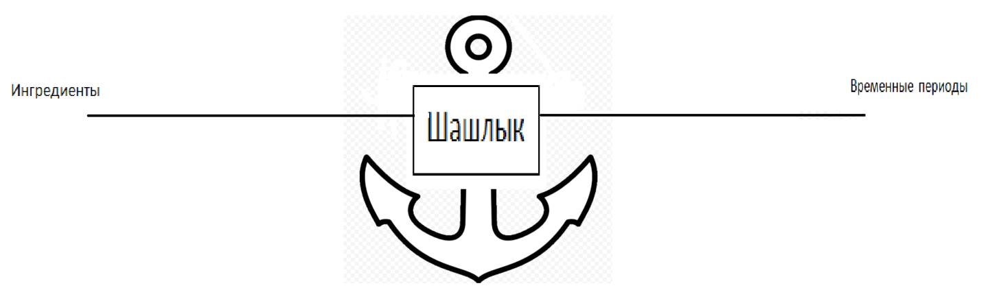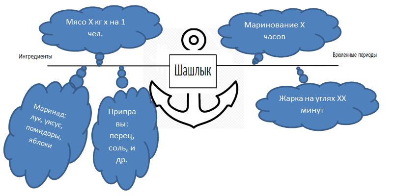 Возьмите листок для создания записей при чтении. Не пугайтесь: это временное упражнение для формирования нового навыка (второго дела, которое нужно будет делать одновременно с чтением). На этом листке, при чтении, нужно записывать основные ключевые идеи, мысли и цели. В одной книге их может быть от одного до нескольких – это и будут якоря. Знайте, когда вы их будете вынимать из памяти, они потянут за собой всё, что с ними было обдумано в процессе чтения, а для этого нужно «привязать» к ним веревочки. Например, якорь и веревочки рецепта шашлыка будут выглядеть так: