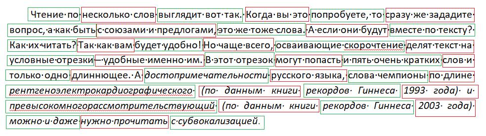 Чтение по несколько слов выглядит вот так. Когда вы это попробуете, то сразу же зададите вопрос, а как быть с союзами и предлогами, это же тоже слова. А если они будут вместе по тексту? Как их читать? Так как вам будет удобно! Но чаще всего, осваивающие скорочтение делят текст на условные отрезки – удобные именно им. В этот отрезок могут попасть и пять очень кратких слов и только одно длиннющее. А достопримечательности русского языка, слова чемпионы по длине рентгеноэлектрокардиографического (по данным книги рекордов Гиннеса 1993 года) и превысокомногорассмотрительствующий (по данным книги рекордов Гиннеса 2003 года) можно и даже нужно прочитать с субвокализацией