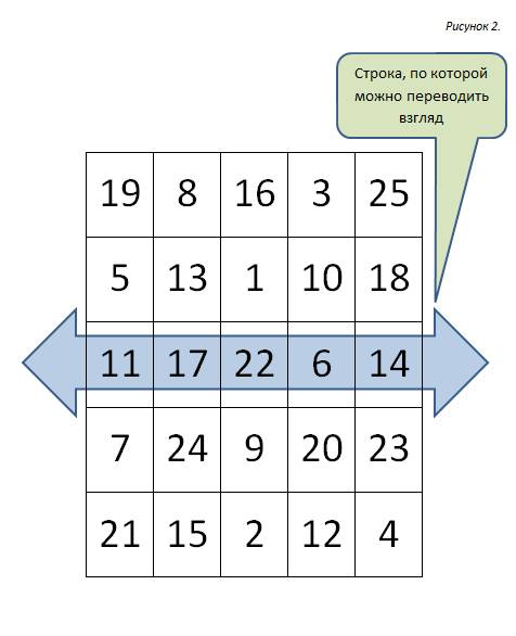 Развивая периферийное зрение в соответствии с рекомендациями из пункта 2.1 «Меняем наше зрение», разыскивая цифры мы переводили взгляд по среднему столбцу, таким образом, мы увеличивали угол воспринимаемой глазами картинки только по горизонтали. Пришло время увеличить угол по вертикали. Вам нужно будет также искать в таблице все 25 цифр по порядку, но теперь взгляд фокусировать можно только на клеточках центральной (средней) строки (смотри рис.2). Примерно через две недели, вы сможете легко читать таблицы Шульте смотря только в центральный квадратик. С этого момента, при чтении таблиц, удерживайте свой взгляд только на центральном квадратике.