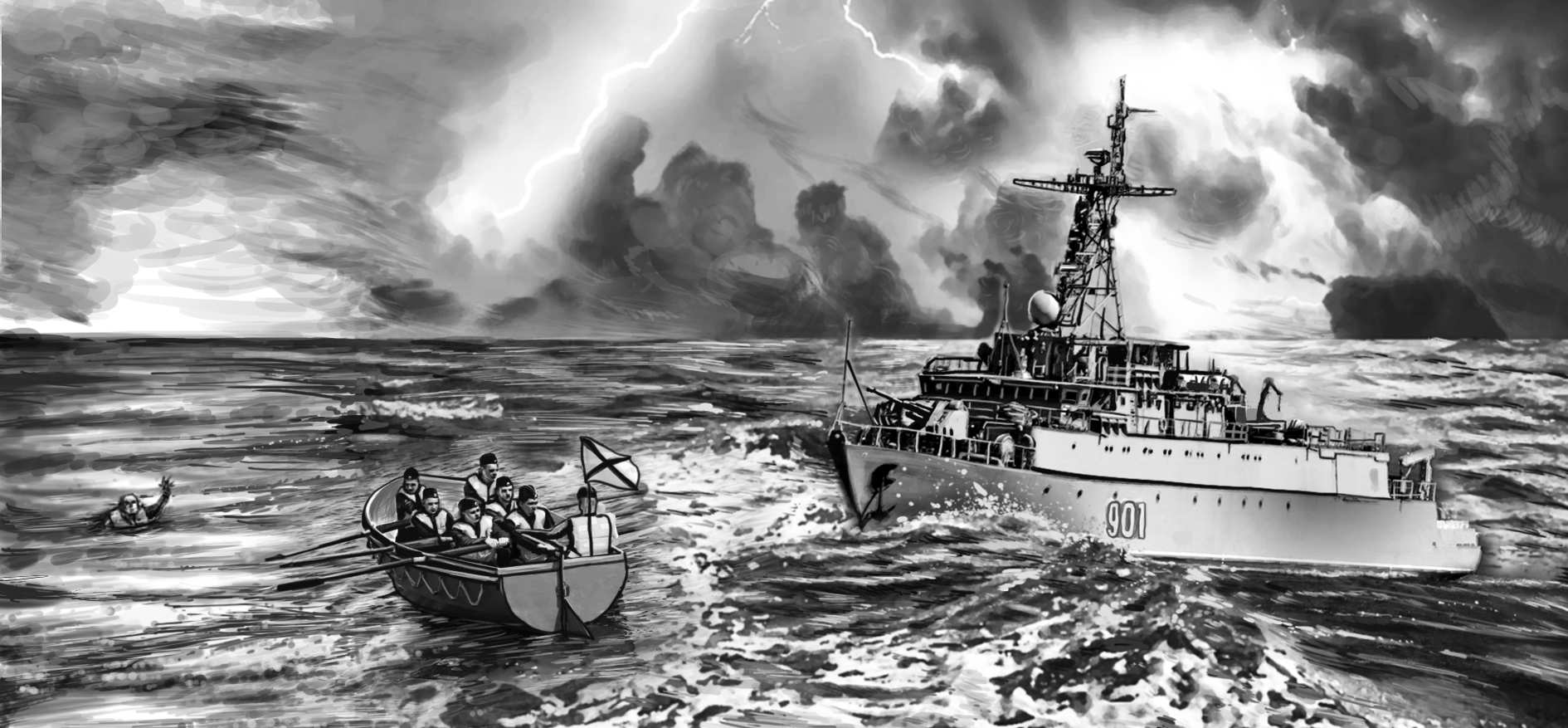 Через несколько секунд после сигнала тревоги наша коробка резко дала право руля, маневр был идеальным с точки зрения дрифта! Нас всех кидануло налево, момент спустя мы сразу увидели оранжевый жилет с машущими руками! Все начали наблюдать за ним, чтобы не упустить из виду, так как мы были уже на приличном расстоянии из-за того, что шли полным ходом, а новость до ГКП дошла не сразу. Роман бултыхался как поплавок, подавая сигналы руками, размахивая ими в разные стороны. Он то поднимался на волне, то на какое-то мгновение скрывался в пучине морской, и именно в этот момент было особо тревожно за него. Мы максимально, как это было возможно, подошли к нему, расчет из моряков уже был в шлюпке. Все произошло очень быстро и слаженно, шлюпка уже была возле него и ребята вытаскивали беднягу. Операция по спасению человека была выполнена на УРА! Когда его подняли на борт, испугу в его глазах мог позавидовать даже Стивен Кинг! Через минуту после того как кэп провел разъяснительную беседу с жертвой инцидента, нас всех собрали в тральном ангаре и капитан, красный от волнения или от злости, заявил: