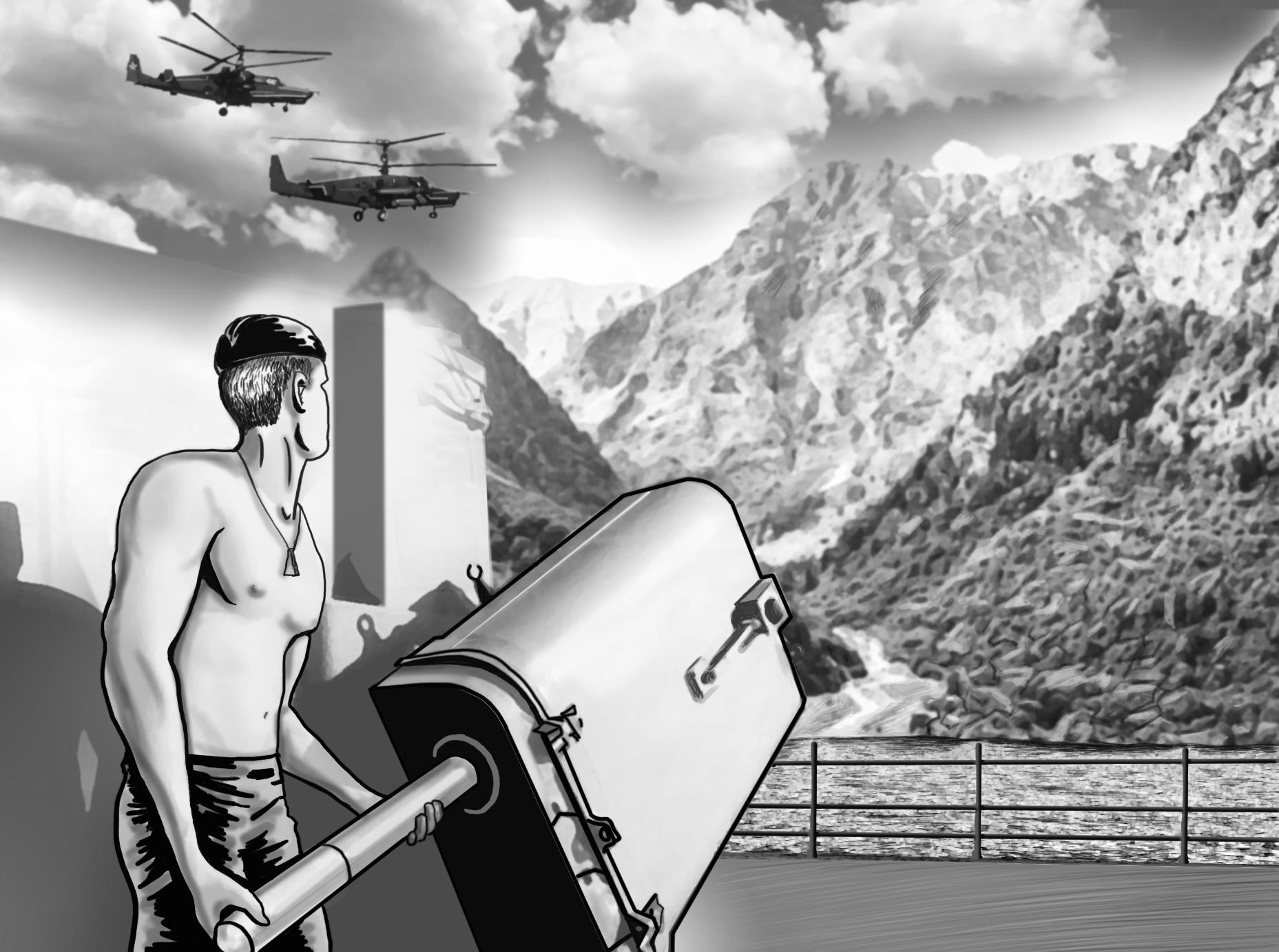 На следующее утро я забрался к своему комплексу ПК-16 и увидел обгоревшее от обстрела орудие. «Да-а! – подумал я. – Поработала ласточка, не подвела!» И вдруг я услышал звук вертолетов: два наших вертолета КА-50, или, как в народе их называют, «черные акулы», обследовали местность возле города, а потом скрылись в горах, направляясь в сторону Кодорского ущелья. Впечатляющий вид, как в кино: горы, ущелье и боевые вертолеты. Потом я услышал звук садящегося грузового самолета Ил-76, затем еще один и еще.