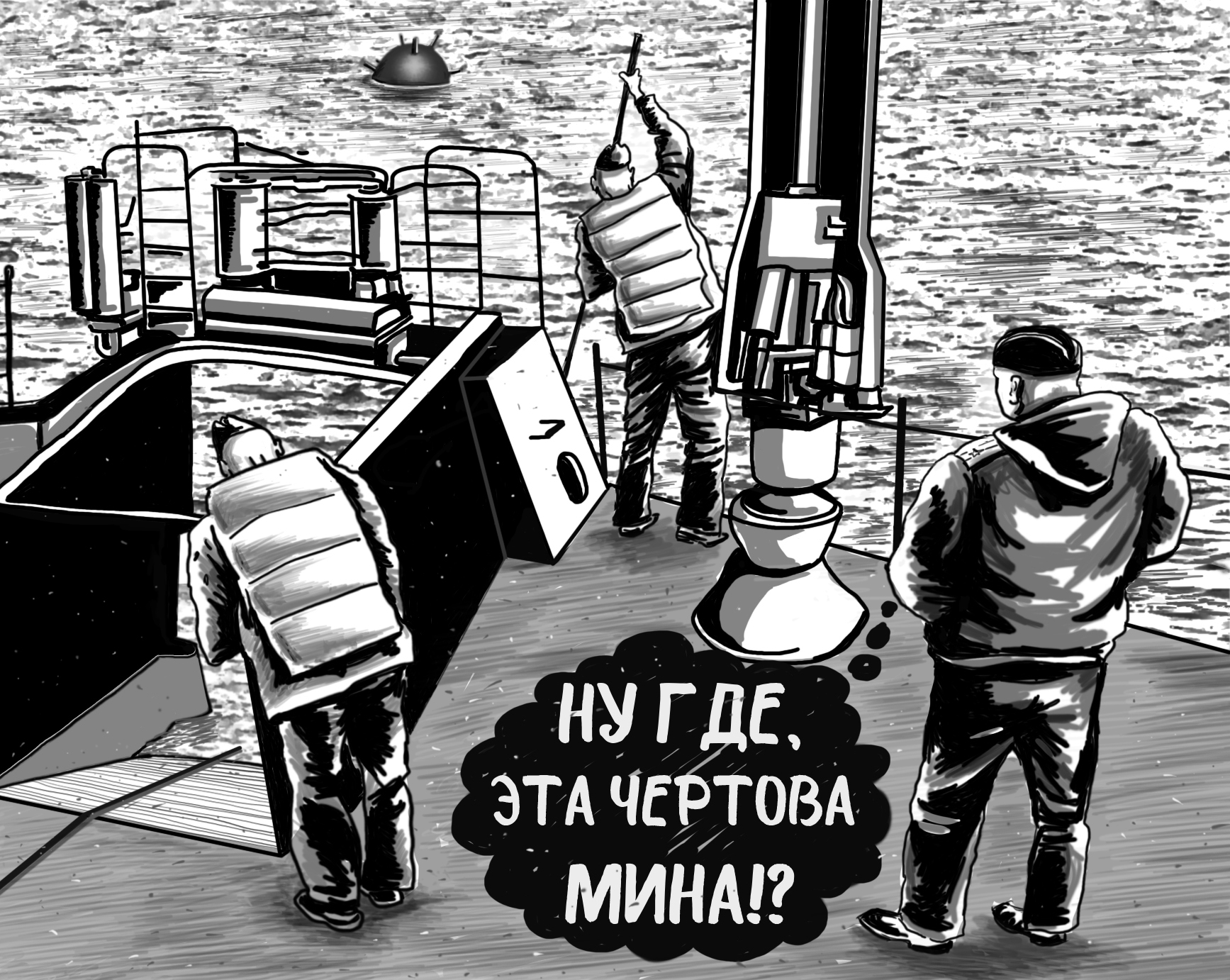 Я был только за. Оказалось, что наша мина зацепилась за днище корабля и в итоге мы поднимали свой зад, трал натянулся, и чуть не случилась беда. Мина была успешно про***на!