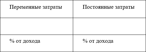 На следующей странице распишите ваши личные затраты по двум колонкам: переменные и постоянные. Какой процент от вашего дохода составляют постоянные расходы, а какой переменные? Остается ли 10 % от вашего дохода для копилки «на мечту»?