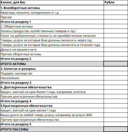 В колонке «рубли» вашего баланса попробуйте проставить суммы активов и обязательств на сегодняшнюю дату. И если ваш актив равен пассиву, то финансовая ситуация под контролем. Молодцы!